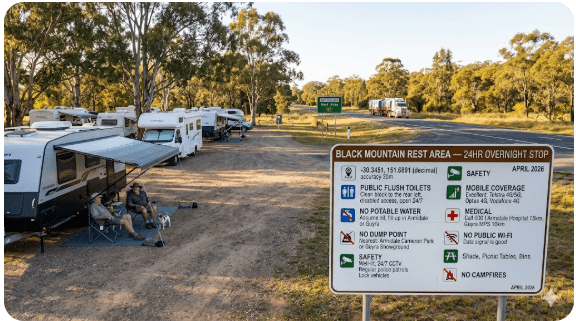 Disclaimer: Black Mountain Rest Area conditions, signage, facility access, mobile coverage and overnight rules can change without notice. Publicly available GPS coordinates are supplied as practical navigation references only and should always be confirmed on site before staying.