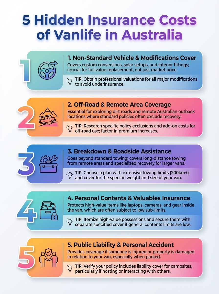Discover the often-overlooked insurance expenses of vanlife in Australia. This infographic breaks down the five hidden costs you should budget for.